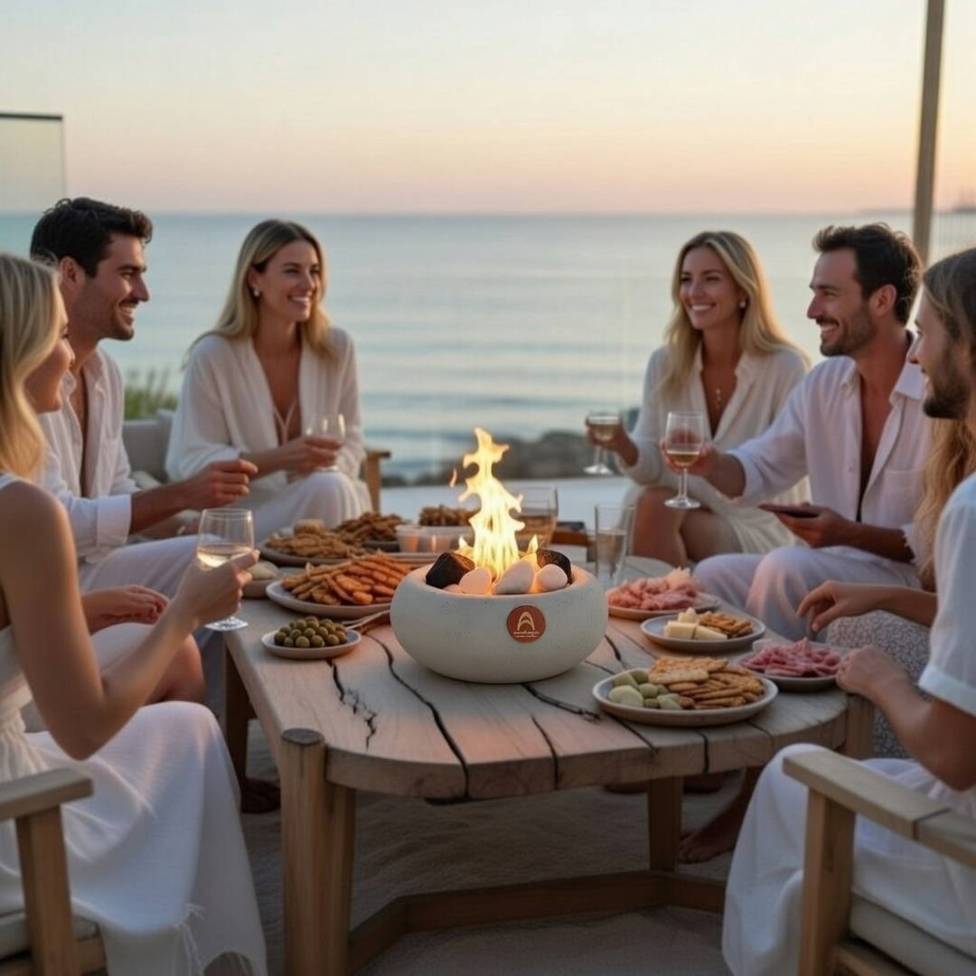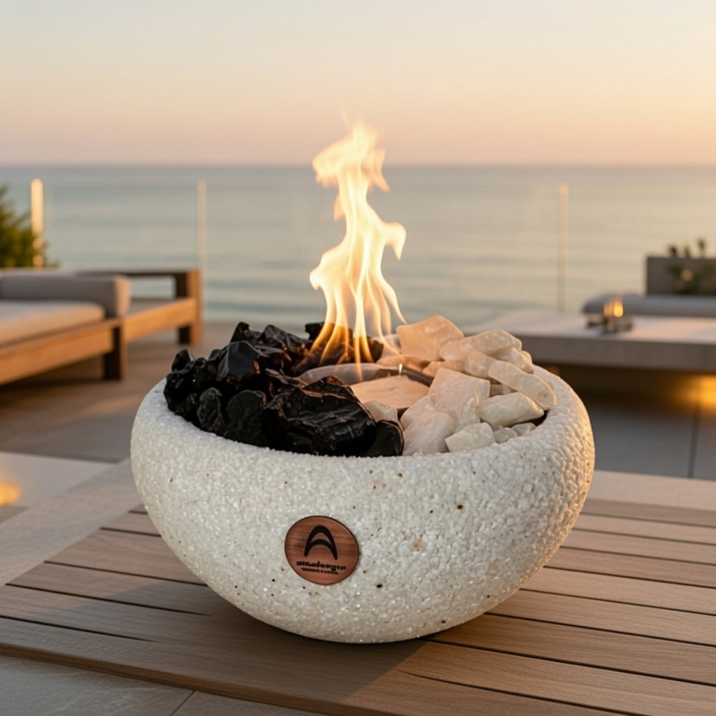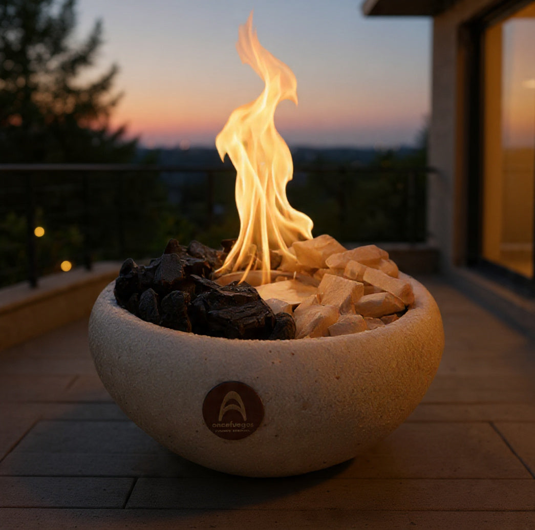 Fuego real con cuarzo natural que aporta armonía y presencia al espacio.