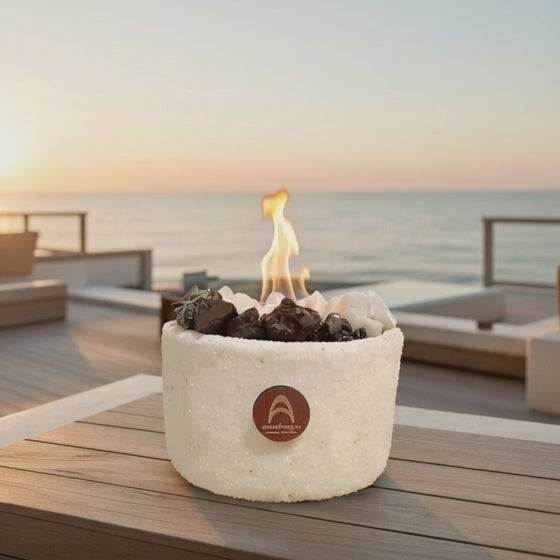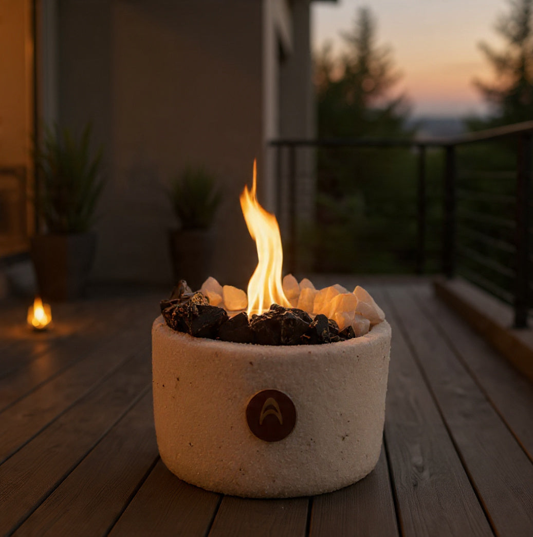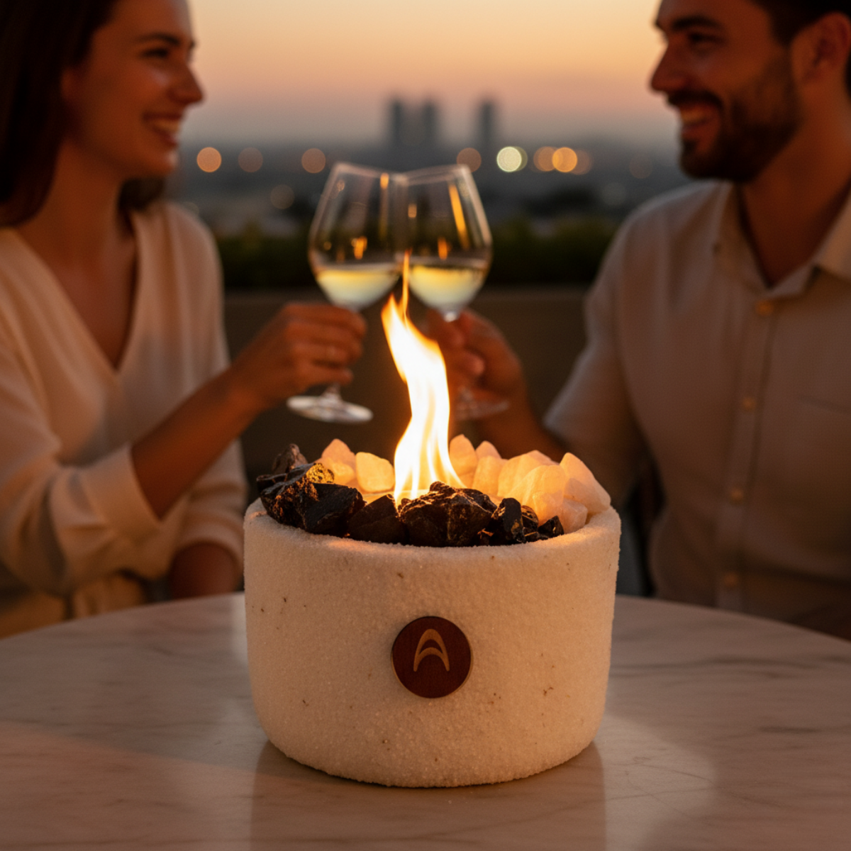 Formato mediano con fuego real y minerales naturales que aportan equilibrio y carácter al espacio.