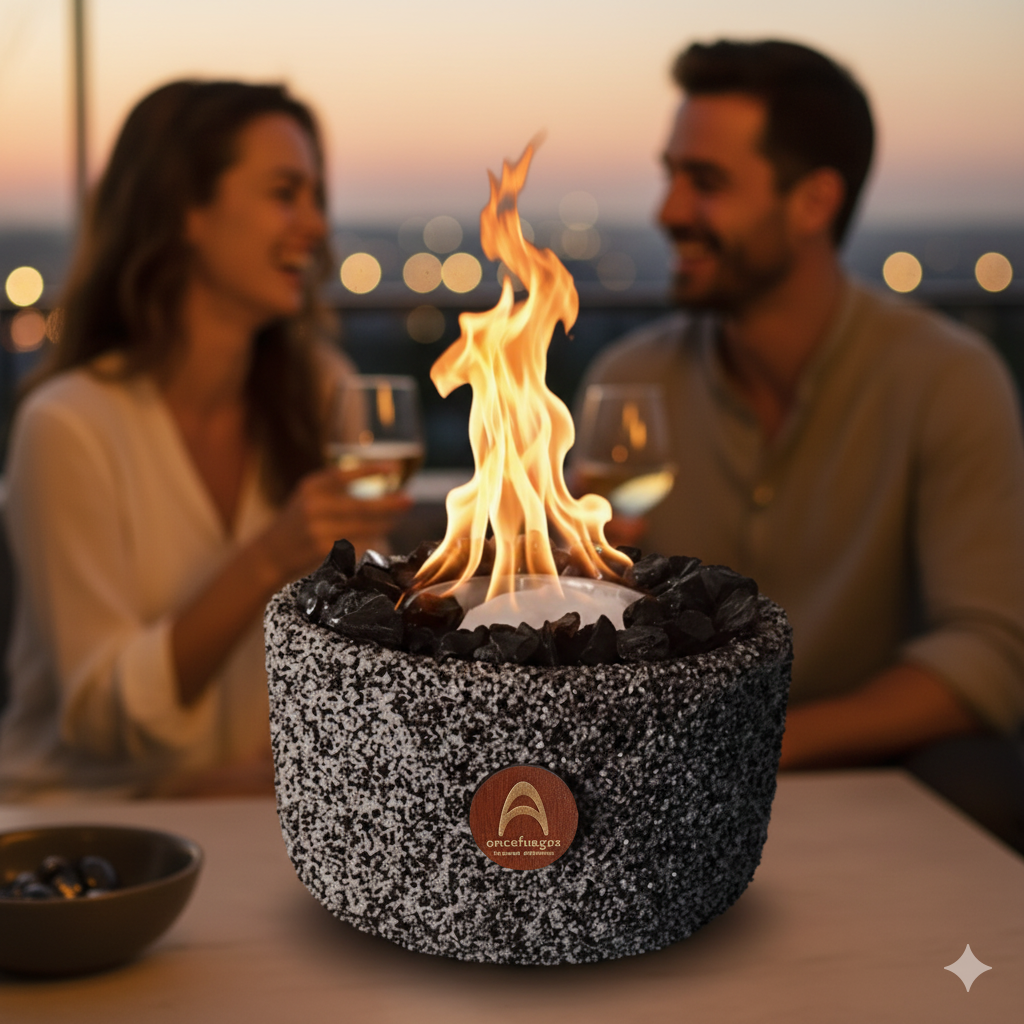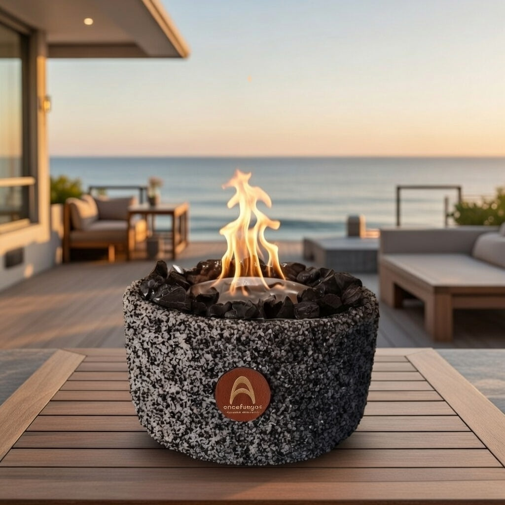 Presencia sólida con fuego real y diseño moderno.